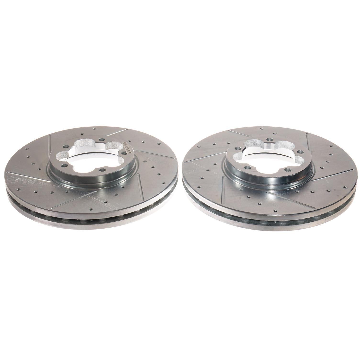 Power Stop drilled and slotted rotors provide a bolt-on upgrade for improved brake cooling and performance. Precision cross-drilled for maximum cooling and maximum performance during extreme conditions; rounded slots sweep away gasses, dust, and moisture to keep a clean friction contact patch on the rotor surface. Silver zinc dichromate plating resists rust and corrosion. With a direct OE fit, there are no special modifications needed.