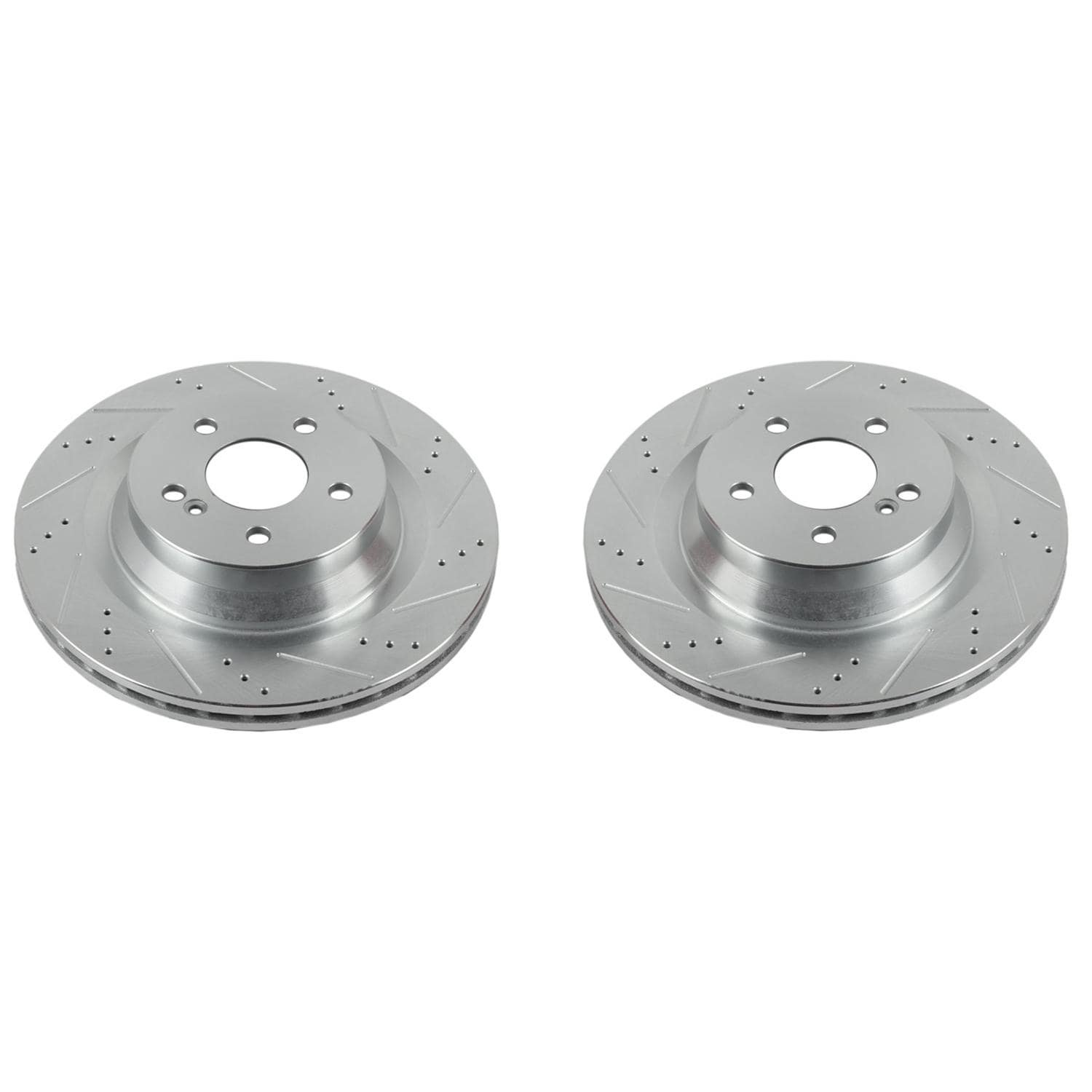Power Stop drilled and slotted rotors provide a bolt-on upgrade for improved brake cooling and performance. Precision cross-drilled for maximum cooling and maximum performance during extreme conditions; rounded slots sweep away gasses, dust, and moisture to keep a clean friction contact patch on the rotor surface. Silver zinc dichromate plating resists rust and corrosion. With a direct OE fit, there are no special modifications needed.
