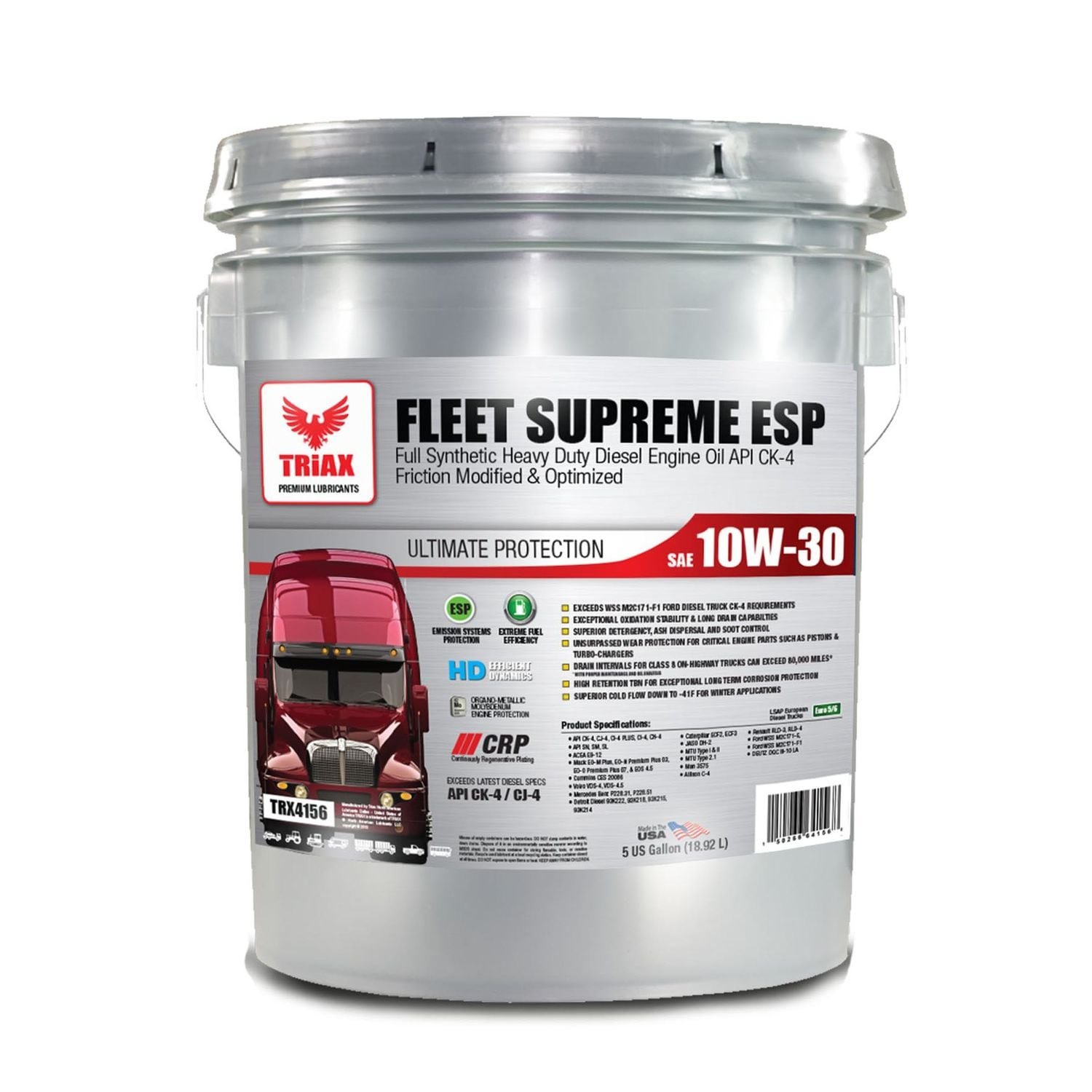 TRIAX FLEET SUPREME ESP CK are the latest technology in heavy duty engine oils, offering the latest in heavy duty diesel specifications, combined with state-of-the-art tested and true anti-wear technology. All TRIAX Fleet Supreme CK products are full synthetic lubricants developed to comply the latest diesel engine OEM requirements and offer backwards compatibility with virtually all heavy duty diesel engines, both North American and European UHPD (Ultra High Performance Diesel) engines requiring Euro 5 and Euro 5 low SAPS engine oils. TRIAX Fleet Supreme products are all formulated with our proprietary CRP (Continuous Regenerating Plating) technology) designed and HD Efficient Dynamics for friction optimization, reduction, unsurpassed fuel economy and unmatched wear protection. High efficiency detergent system and high retention TBN keep your engine ultra clean and prevent corrosion, acid and maximize overall engine protection to the highest degree.